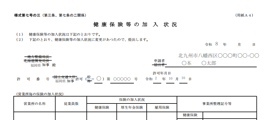 また提出先の福岡県知事の福岡県も記入する必要があります。許可年月日は初めて取得した時のものではなく、前回取得した日を記入します。